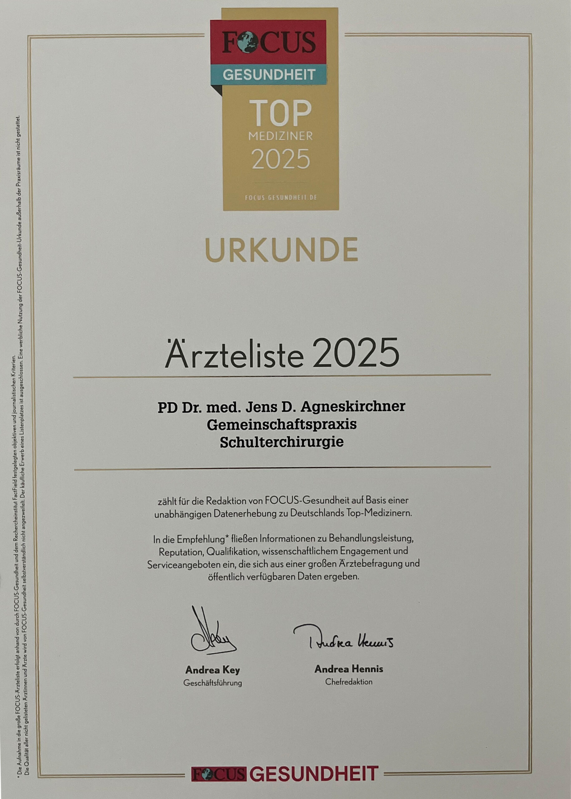 - Gelistet als Schulterexperte in der Ärzteliste des Focus seit mehreren Jahren